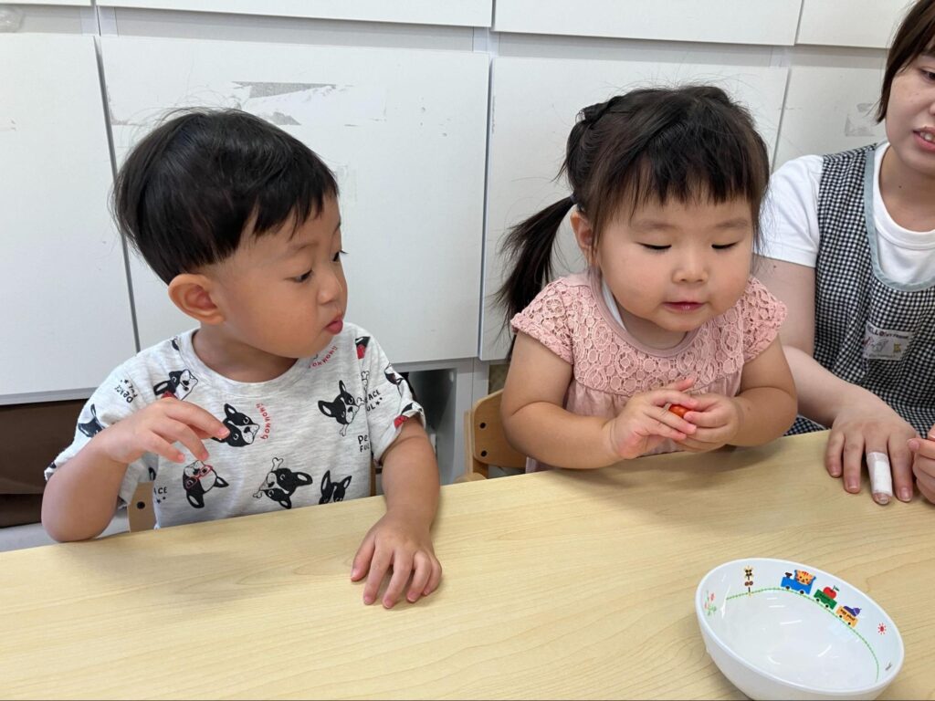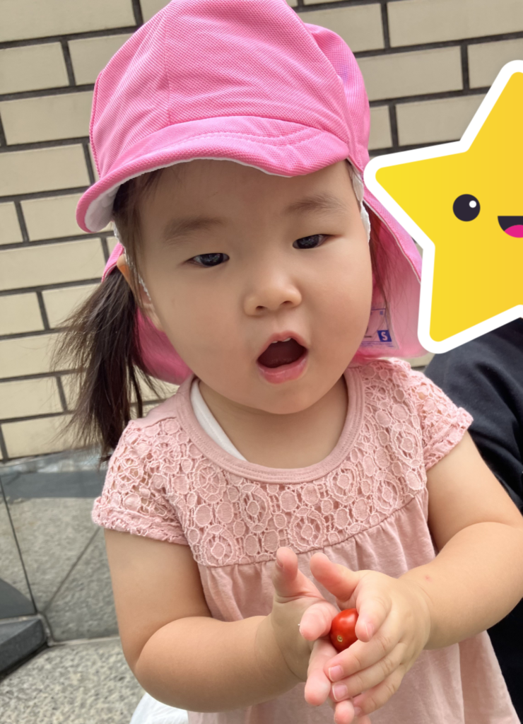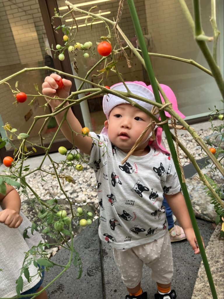 高い所に実っているミニトマトを一生懸命に背伸びをして採っていました。綺麗に洗った後は、皆で美味しく頂きました。プシュッと汁が出てきて驚いていましたが、美味しそうに微笑んでいました😊