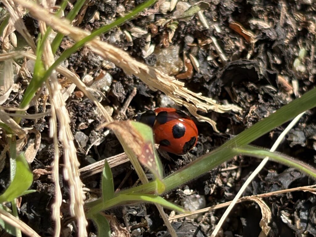 公園で遊んでいると、葉っぱの上に小さなテントウムシを発見!