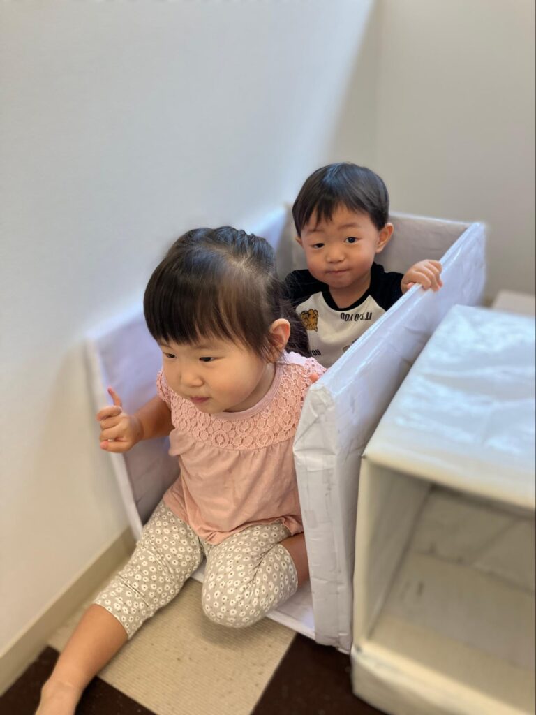 ぺんぎん組では乗り物が大ブームです。室内にある箱を電車に見立てては、「しゅしゅぽぽー」と楽しそうにみんなで掛け声をしながら遊んでいます♪