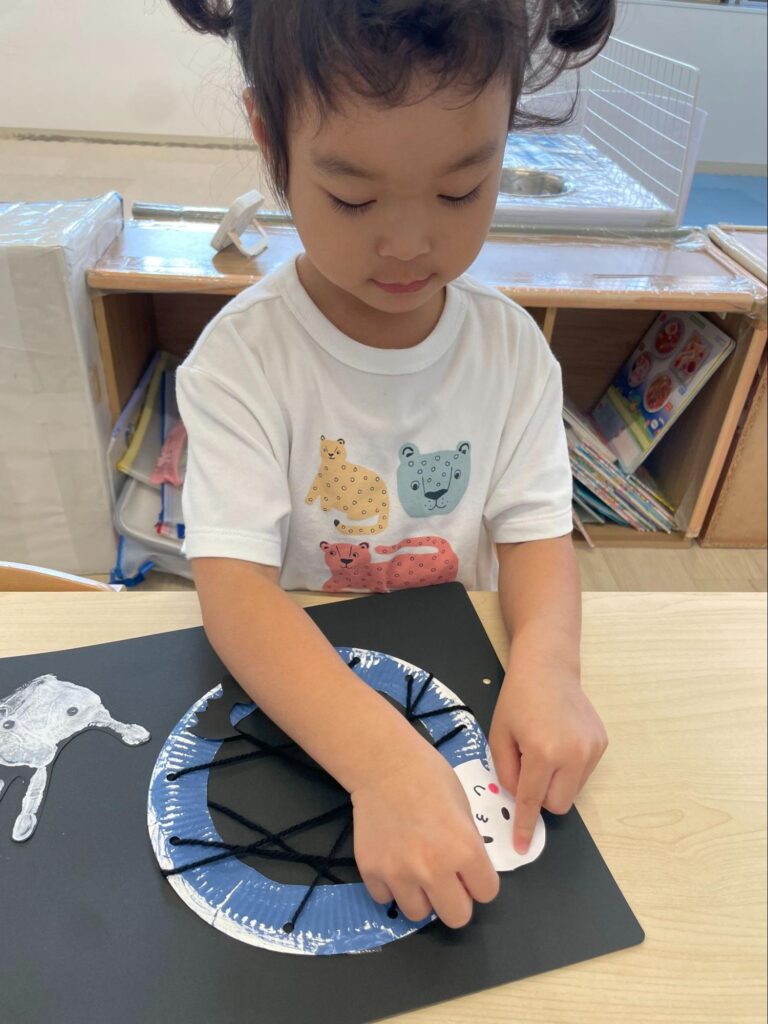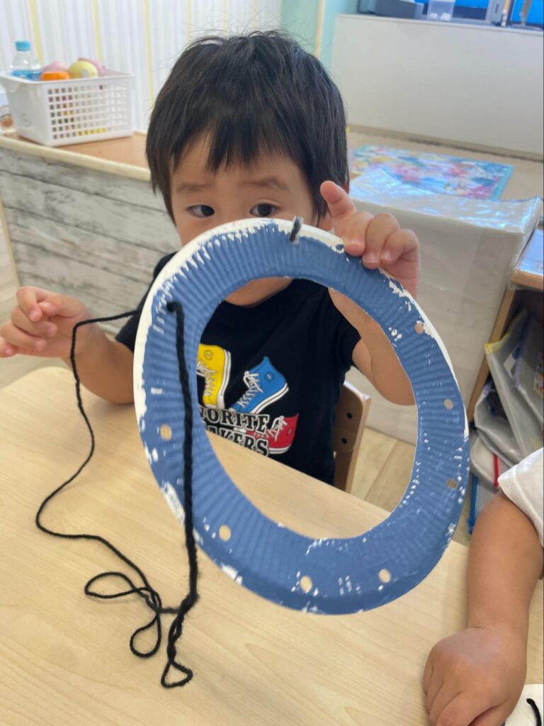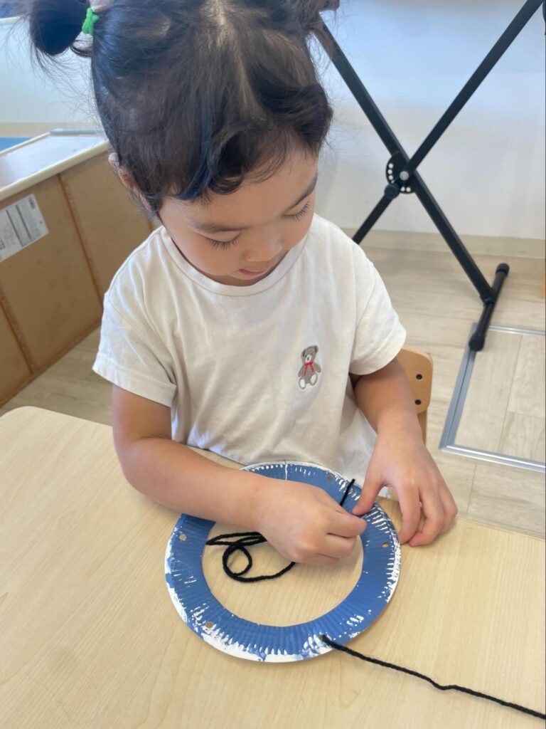 普段紐通しの玩具で遊んだりしていたので、子ども達も楽しそうに、「どこからいれようかな~」などと悩みながら製作をしました。