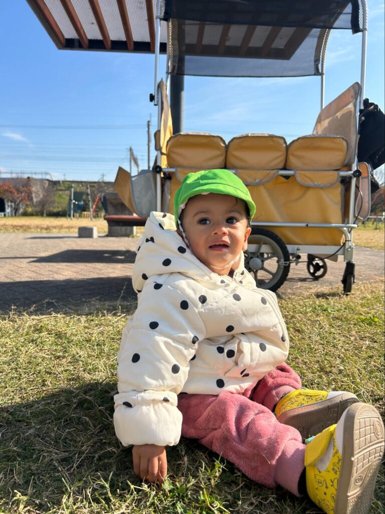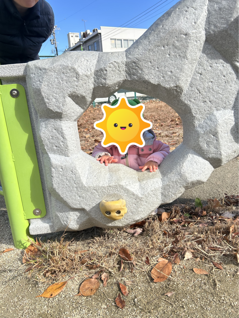つかまり立ちや歩き始めたばかりの子は保育士と手を繋いで公園内を歩き回ったり、座って葉っぱや石を拾ってみたりと自然に触れています。