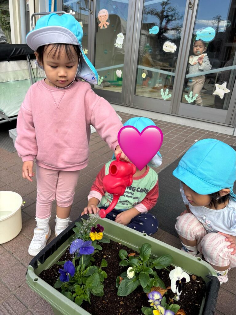 育てていることでお花に興味を持ち始め散歩中にも「(保育園で育てている)おなじパンジーだ」「みて!あかいろのおはな!」と見つけて話す様子も見られます。