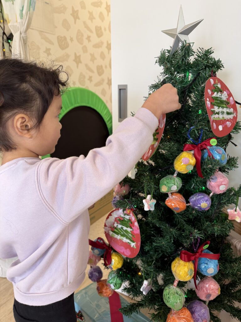 出来上がった飾りは玄関のクリスマスツリーに飾り付けられました。自分で飾りたい場所に付けることで、楽しみも倍増ですね。