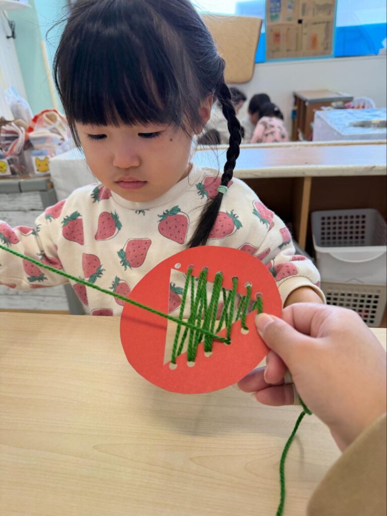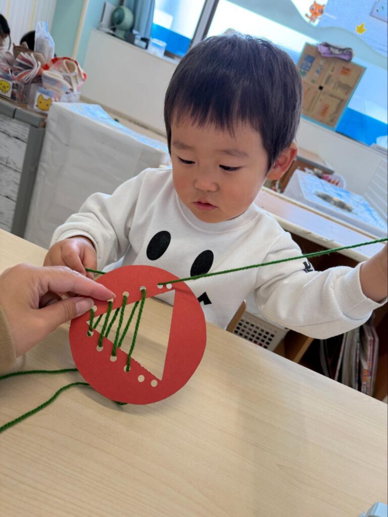 前回紐通しをした時には、中々思ったようにできなくて苦戦している子もいましたが、今回は楽しそうに「しゅるしゅる〜!」などと声に出しながら上手に紐通しをしていました!