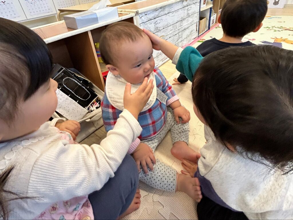 最近では合同保育中に、かめ組の赤ちゃんを「かわいいねえ」「よしよし」と優しく語りかけるお姉さんお兄さんな子ども達の姿も見られます。