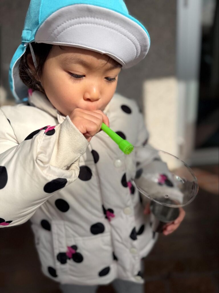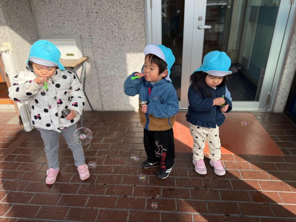 自分たちでシャボン玉を飛ばせれるのが楽しいようで、時間があれば「シャボンだまするー!!!」と提案してくれます♪