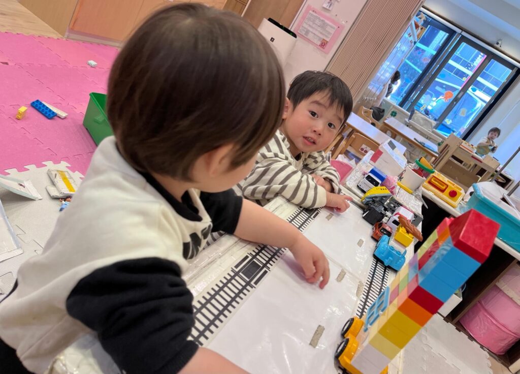 言葉の発達と共に子ども同士でのやりとりも増え、おままごとやブロックなどオモチャで一緒に遊ぶ姿が多く見られるようになりました!