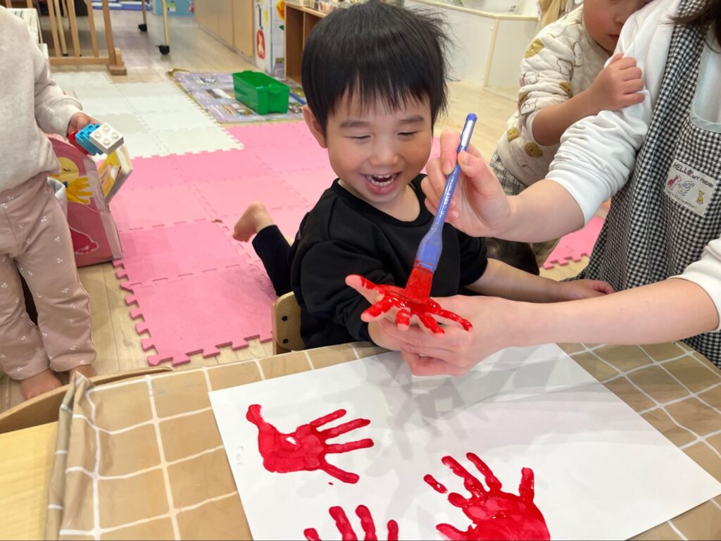 「おてて、赤色ぺったんしたね!」と製作が終わった後も嬉しそうに教えてくれました🎨