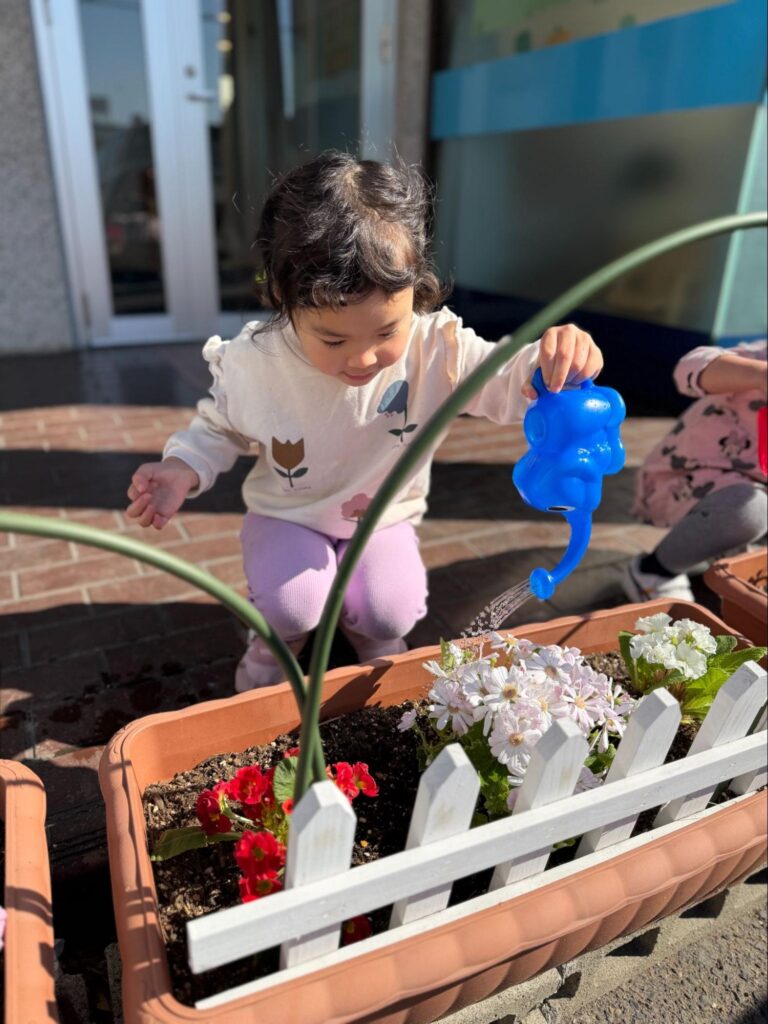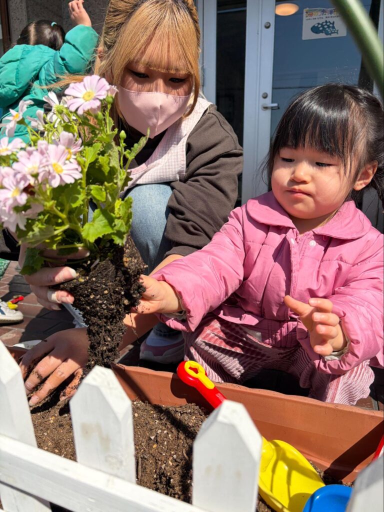 保育園前の花壇にみんなで花を植えました!以前近くのスーパーで自分たちで好きな花を選んだので、植える時も嬉しそうに「これ〇〇えらんだやつー!やるー!」と一緒に植え、あまり元気がないお花もいるか組さんの元気と可愛さでお花も最近は元気になってきました!