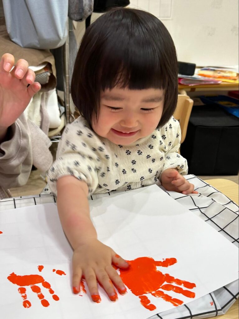 室内では製作の指スタンプと手型に挑戦!絵の具の色や感触を楽しみながら、個性あふれる作品ができました!